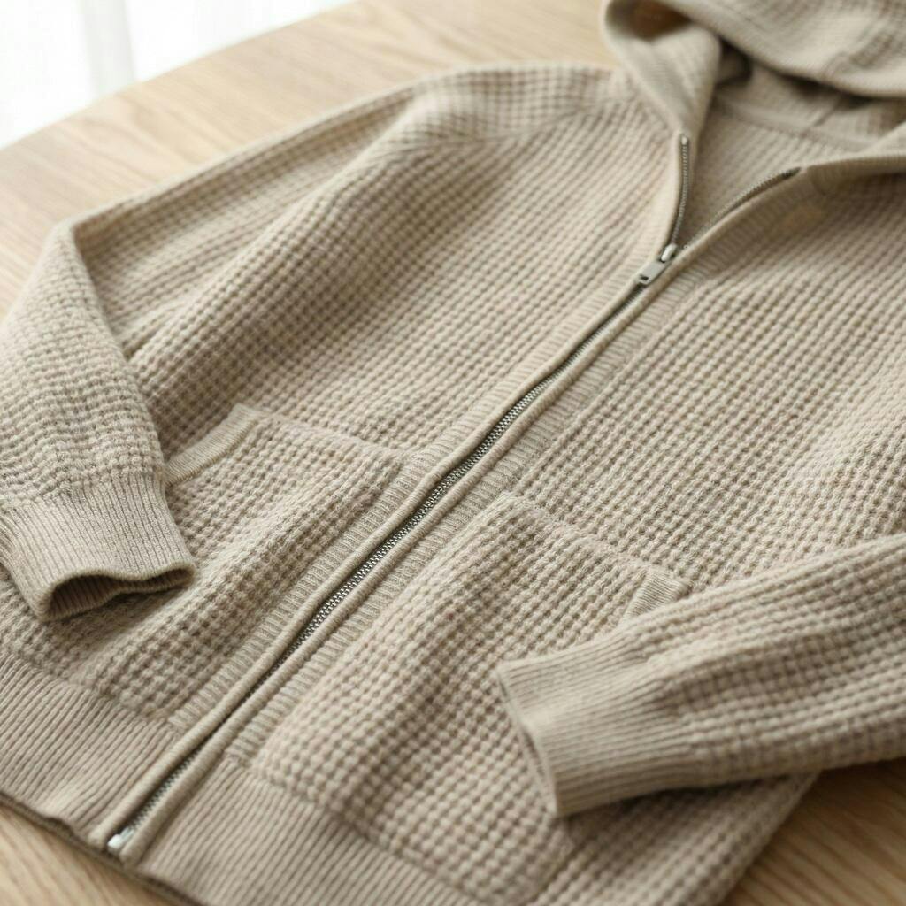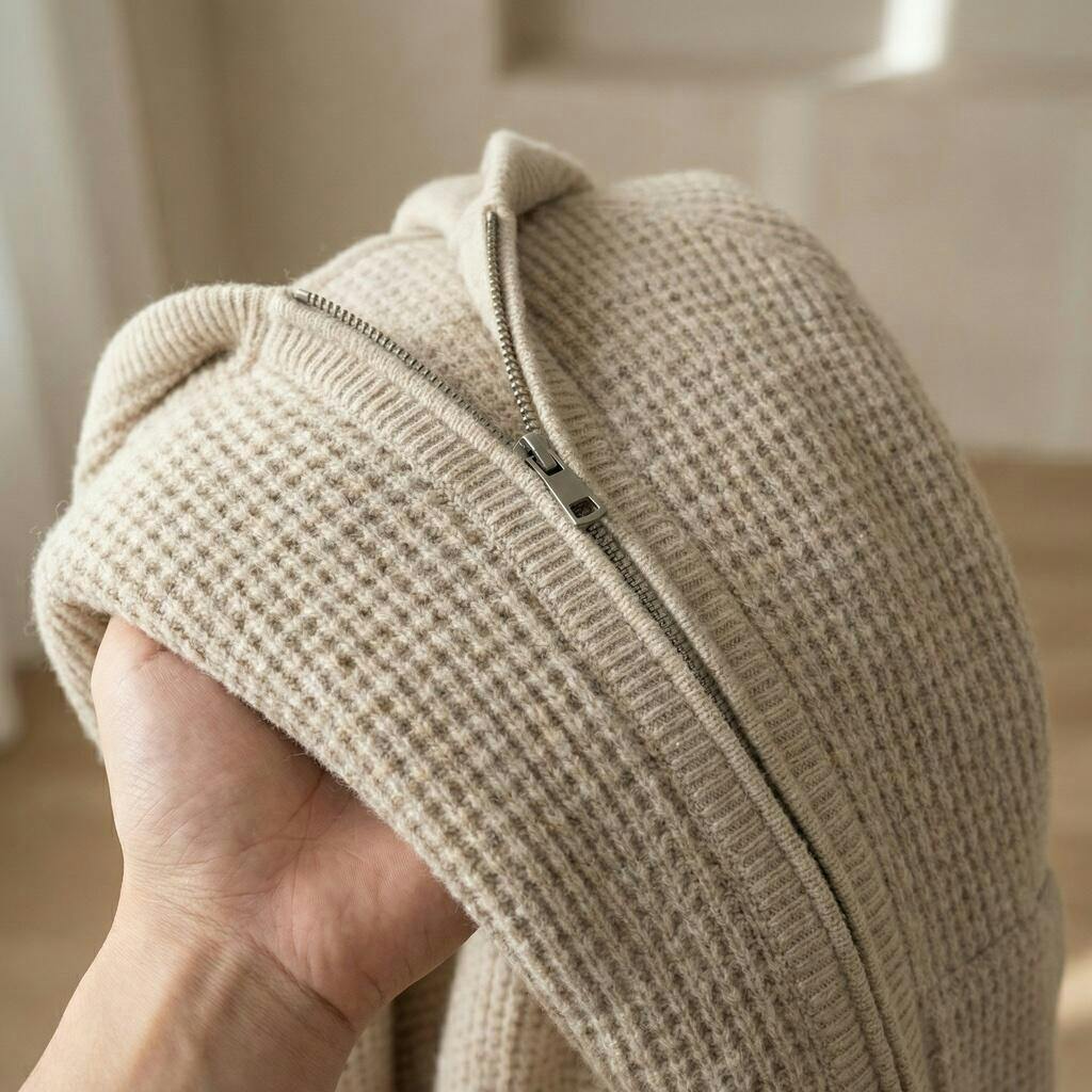 Este casaco de malha com fecho combina conforto absoluto com uma estética limpa e sofisticada.